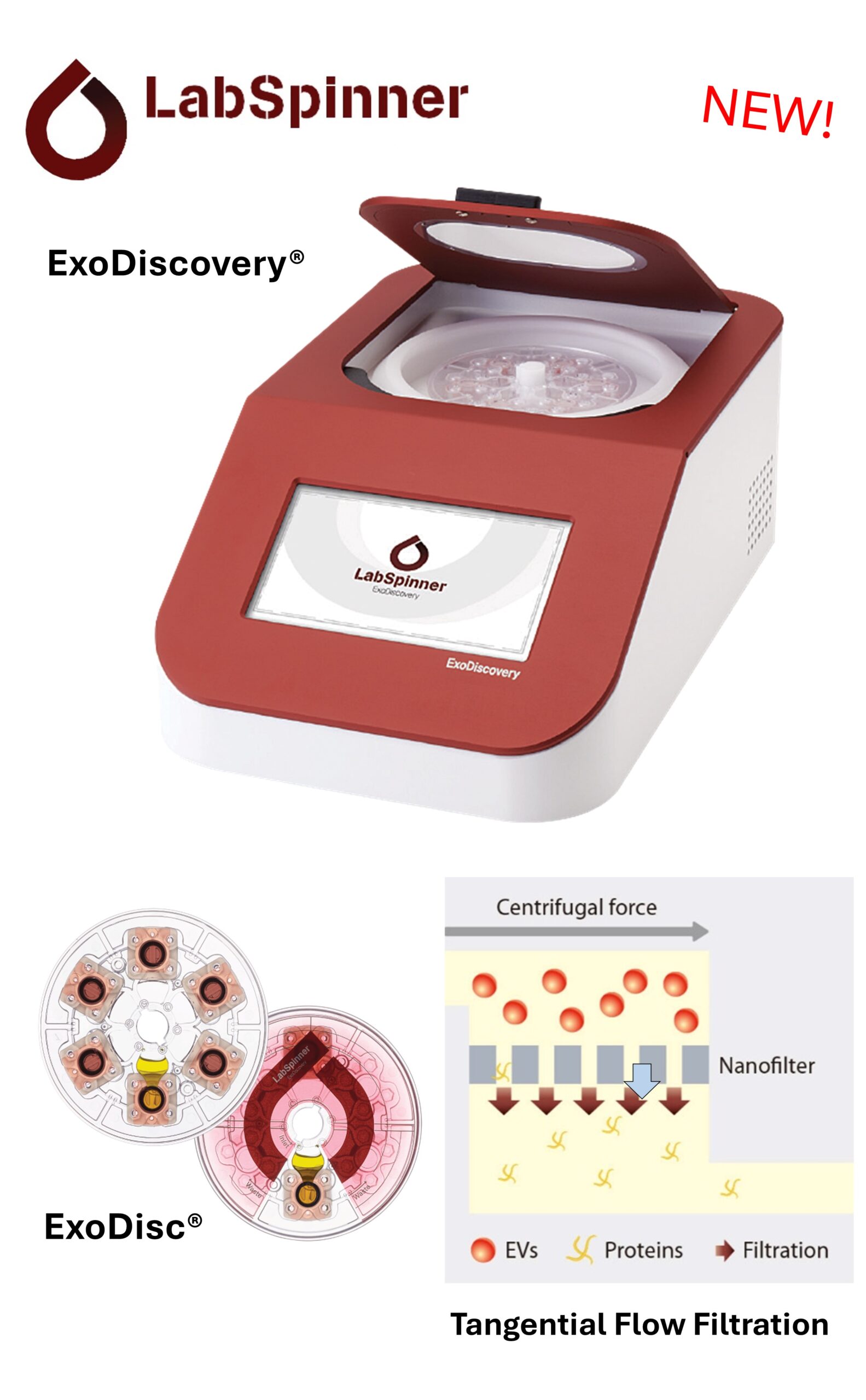 Dunn Labortechnik presents the ExoDiscovery® tabletop centrifuge from LabSpinner which is designed for rapid isolation of nanoscale extracellular vesicles (EVs). Using disposable ExoDisc® -D20 or -D100 cartridges and optimized protocols, the user can easily isolate EVs with sizes of >20 nm or >100 nm from a variety of biological samples such as plasma, serum, urine, cerebrospinal fluid (CSF), bronchial wash and many more in as short as 15 – 60 minutes.