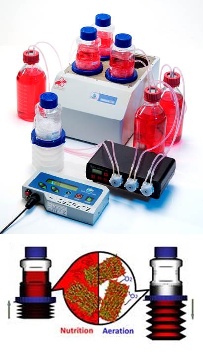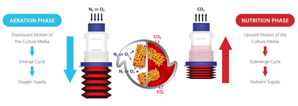 The disposable BelloCell® is based on the concept of bellow-induced alternating flow of media and air through porous BioNoc II® or BioMESH® macorcarriers, where cells reside and grow, providing low shear stress, high aeration and foam-free culture environment, thus enabling culturing of high cell densities.